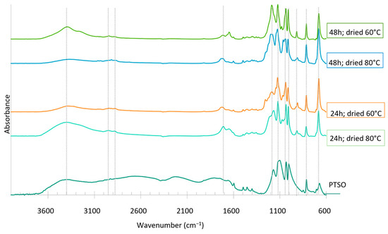 Figure 11 presents the FTIR spectra of the dried sugar solutions recovered from the aqueous phases of water extraction of two bio-oils (24 h and 48 h) of the first liquefaction reaction. The spectra exhibit bands of the catalyst, specifically at 1102, 1032, 1005, 814, and 673 cm−1 of the R-SO2-OH, O=S=O, S-C, and S-O bonds. Therefore, it is possible to conclude that the catalyst is transferred to the aqueous phase during the extraction process, a hypothesis further corroborated by the acidic pH of the extraction waters (1.7 in this case). Additionally, the spectra have a band in the region of 3300 cm−1, indicating the presence of hydroxyl (-OH) groups associated with either moisture or alcohol. As expected, the intensity of this band decreases as the drying temperature increases from 60 °C to 80 °C.
