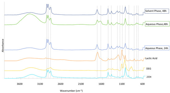As seen, the spectra of the aqueous and organic phases present the same peaks. Furthermore, the peak characteristics of 2EH (2960, 2929, 2873, 1462, 1121, 1035, 826, 768, and 729 cm−1) and DEG (1215, 1121, 1035, 961, and 892 cm−1) are present in the condensates, which confirms that part of the solvents is carried over during water evaporation. Additionally, the peaks at 1731, 1235, 1178, and 1117 cm−1, corresponding to C=O bonds, -COOH groups, C-O bond vibrations, and C-OH vibrations, respectively, which are attributed to carboxylic acid functional groups, are also present in the condensates but not in the solvents. In a comparison with the spectra of different compounds, it was observed that these peaks can be due to the presence of lactic acid in the condensates, which were also carried away from the reaction medium during evaporation.
