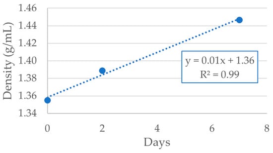 The density measurements of the fresh and aged bio-oils are presented in Figure 15. As expected, the density of the bio-oils increases with the storage time [37] and follows a linear relation (R2 = 0.99). This density increase can be attributed to the occurrence of repolymerization reactions due to the presence of free radicals in the biofuel. These radical reactions form compounds with larger molecular weight, thereby increasing the overall density of the biofuel.