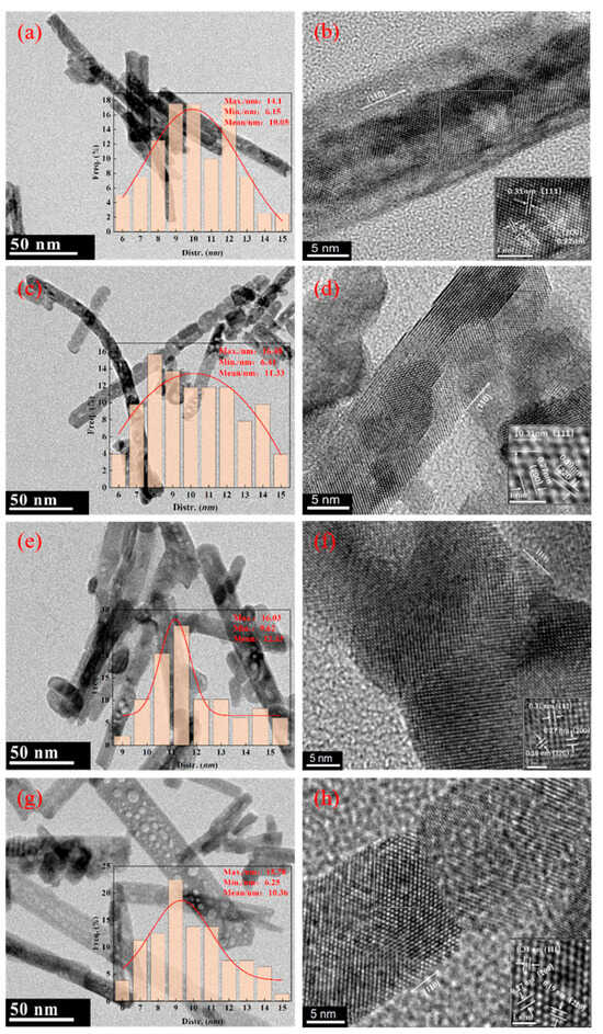 The two type catalysts were tested by HR-TEM, and microscopic morphology images are shown in Figure 4, with the particle size distribution of SC-400, SC-500, SC-600, and SC-RF-600 shown in Figure 4a,c,e,g, respectively. It was observed that CeO2 was mainly distributed in the form of rods, with average transverse diameters (~50 particles were measured) of 10.05 nm, 11.33 nm, 12.33 nm, and 10.36 nm, respectively, which generated the same trend and was consistent with XRD result (11.6 nm, 12.1 nm, 14.2 nm, and 12.6 nm, respectively). The longitudinal length was uneven, which was in the range of 27.7–143.6 nm, 22.5–223.5 nm, 28.9–142.3 nm, and 40.9–269.8 nm, respectively. Undoubtedly, the surface of CeO2 nanorods modified by RF plasma possessed a larger number of pits compared with the other three samples, which was caused by the etching effects of high-energy particles in RF plasma, continuously bombarding the CeO2 surface. Therefore, the specific surface area of CeO2 was increased, and caused the dislocation of CeO2 lattice defects and oxygen vacancies. A shown, Figure 4b,d,f,h corresponded to the HR-TEM images of the four catalysts. Combined with the analysis of Fast Fourier transform (FFT), three lattice fringes of (111), (200), and (220) were clearly observed, with lattice spacings of 0.31 nm, 0.27 nm, and 0.19 nm, respectively [29]. Wherein CeO2 nanorods mainly exposed the (110) and (100) planes, showed a one-dimensional growth structure with preferential growth along the (110) crystal direction, and provided CeO2 nanorods with a higher lattice oxygen mobility [30].