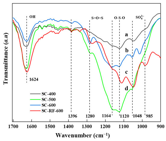 The FT-IR spectra of the catalysts are shown in Figure 5. At 1627 cm−1, we observed the bending vibration peak of physically adsorbed water on the sample surface [31]. The band at 900–1300 cm−1 corresponded to O=S=O and O-S-O anti-symmetric stretching vibration and symmetric stretching vibration peak. The broad bands at 1030–1080 cm−1, 1120–1150 cm−1, and 1396 cm−1 are indexed to the characteristic peaks of /MxOy solid superacid [10,32]. The absorption peak at 985 cm−1 is related to the symmetrical tensile vibration of S-O, which is the characteristic peak of sulfate metal oxide [5,33]. The broad bands at 1280 cm−1 and 1164 cm−1 correspond to the antisymmetric O=S=O tensile vibration on persulfate ions. From the above analysis, the characteristic vibrational peaks of S=O and S-O bonds confirmed the existence of a superacid structure in the four samples [34]. In /MxOy, the coordination form is distinguished according to the position corresponding to the infrared absorption of S=O stretching vibration. The metal ions of MxOy and were combined in the form of bridging bi-coordination with an absorption peak above 1200 cm−1 or chelate bi-coordination with an absorption peak below 1200 cm−1 [35]. The three catalysts had absorption peaks above 1200 cm−1 and below 1200 cm−1 in Figure 5b–d, except for SC-400 in Figure 5a, demonstrating the acid center structure was formed with the coordination of bridging bi-coordination and chelate bi-coordination. In comparison, SC-RF-600 in Figure 5d had stronger absorption peaks at 1396 cm−1, 1280 cm−1, 1120 cm−1, and 1048 cm−1. This may be caused by the increase in oxygen vacancies after RF modification, hence forming more coordination bonds.