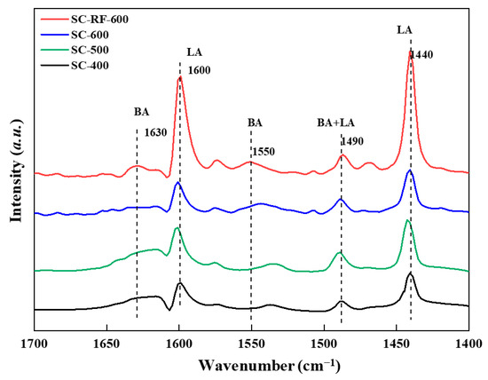 Py-IR analysis was carried out to evaluate the surface acid density, and the results are shown in Figure 6. It was found that the trend of acid distributions was consistent at 150 °C and 300 °C (Figure S1 and Table S1), hence, we just adopted the test result at 150 °C close to the experimental environment. The bands at about 1550 cm−1 and 1630 cm−1 represent Brönsted acid (BA) sites; the bands at about 1440 cm−1 and 1600 cm−1 belong to Lewis acid (LA) sites; and the band at around 1490 cm−1 corresponds to BA sites and/or LA sites [36]. The acid density of each catalyst is shown in Table 2: as the temperature increased, the density of BA was increased, while the density of LA and total acid were increased firstly and then decreased (Entrys 1–3). This may be due to an increase in particle size, reduction of specific surface area and oxygen vacancies caused by calcination at the higher temperature (see Section 2.2 and Section 2.3 for detailed analysis), thereby resulting in a decrease in LA sites, thus reducing LA sites. The BA density/LA density value of SC-RF-600 was low, but the BA density, LA density, and total acid density were the largest (Entry 4). Additionally, the BA and LA density of SC-600 was 14.52 μmol·g−1 and 30.80 μmol·g−1 (Entry 3), respectively. However, the BA density of SC-RF-600 modified by RF plasma remained basically unchanged at 13.83 μmol·g−1, and the LA density was increased and almost doubled to 65.66 μmol·g−1 (Entry 4). From the above analysis, RF had a significant effect on the LA density of the solid superacid.