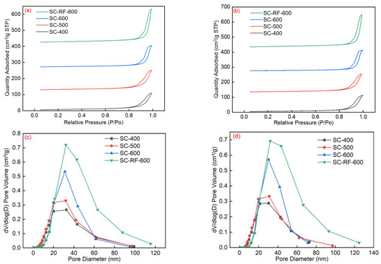 The N2 adsorption–desorption isotherms of the samples tested twice are depicted in Figure 7. In Figure 7a,b, according to the classification of the IUPAC, these samples presented atypical type IV isotherms, along with the hysteresis loop isotherm which had no obvious saturated adsorption platform and belonged to the H3 type [5], indicating that the stacking of nanorods led to irregular pore structures. The pore size distributions of the catalyst are displayed in Figure 7c,d; the average pore size of SC-RF-600 was ~36.01 nm and was ascribed to mesoporous structure. The pore structure properties of the catalyst are illustrated in Table 3. As the temperature increased, the pore volume increased (Entrys 1–3). As the crystallinity of SC-400 and SC-500 was low, and they possessed more amorphous CeO2 when calcined at 400 °C and 500 °C, hence the specific surface area was increased accordingly (Entrys 1 and 2). However, part of the micropores over CeO2 collapsed into large pores at 600 °C, as a higher temperature can cause grain growth and reduce the specific surface area [37]. Noticeably, SC-RF-600 had the largest specific surface area (37.60 m2/g, Entry 4), the pore volume of SC-RF-600 (0.33 cm3/g, Entry 4) was larger, but the pore size was smaller (36.01 nm, Entry 4) when compared with those of SC-600 (36.08 nm, Entry 3). In summary, RF modification could effectively avoid the agglomeration of CeO2 caused by high temperatures, improving the dispersion of CeO2 and increasing the specific surface area accordingly.
