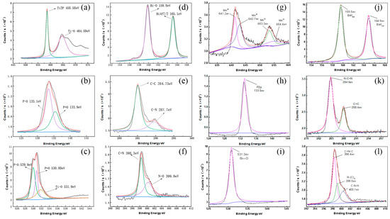 Figure 4 shows the XPS peak position, peak height, and peak width of each element in Ti-BPC. The peak areas of Bi and O are the largest; there are obvious peaks at the binding energies corresponding to P=O and P-O; obvious main peaks corresponding to P, Bi, and Ti binding to O are visible; and the main peaks of C and N correspond to the binding energies of C-C and C=N, respectively. The larger the peak area is, the higher the crystal phase content; the narrower the peak is, the larger the crystal grains. The XPS analysis of Mn in Figure 4g shows that the signal peaks at 641.28 eV and 653.58 eV correspond to Mn3+ and Mn2+, respectively, indicating the presence of both trivalent and divalent manganese ions in the catalyst. Figure 4h analyzes the P element. In the Mn BPC system, the P element has a characteristic peak at 132.88 eV, which is close to the binding energy of P2p. Figure 4j shows the analysis of Bi, with two peaks at 159.5 eV and 164.9 eV, corresponding to the binding energies of Bi4f5/2 and Bi4f7/2, indicating that the Bi element of BiPO4 exists in the +3 valence state in the composite photocatalyst. Figure 4k shows the analytical spectrum of C, where the two peaks of 284.6 eV and 288.4 eV correspond to N-C=N and C=C bonds. The analysis spectra of O and N correspond to Figure 4i,l, respectively. The peak photoelectron analysis spectra of O are at 531.3 eV, indicating the presence of Bi-O bonds in the catalyst. The analysis spectra of N correspond to C=N-C, N-(C)3, C-N-H at 398.4 eV, 399.5 eV, and 400.1 eV, respectively. The increase in peak area of C=N-C bonds indicates the chemical interaction between g-C3N4, BiPO4, and manganese ions [24], This leads to an increase in the strength of carbon nitrogen conjugated π bonds, as shown in Figure 4.