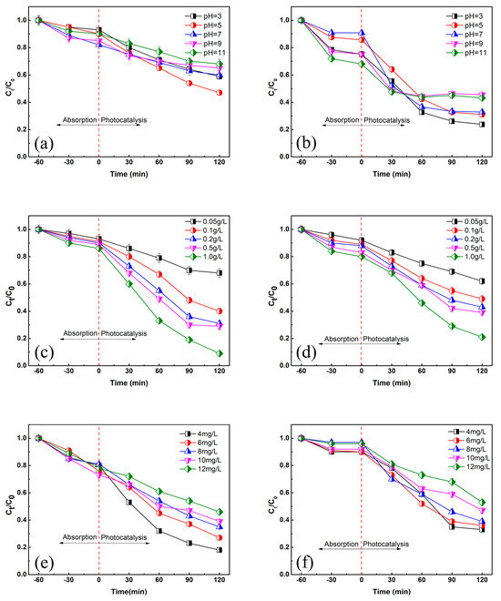 Effects of different influencing factors on the photocatalytic degradation efficiency of TC-HCl by Ti-BPC and Mn-BPC ((a) effect of pH on Ti-BPC, (b) effect of pH on Mn-BPC; (c) influence of dosage on Ti-BPC; (d) influence of dosage on Mn-BPC; (e) influence of initial concentration of tetracycline on Ti-BPC; (f) influence of initial concentration of tetracycline on Mn-BPC).