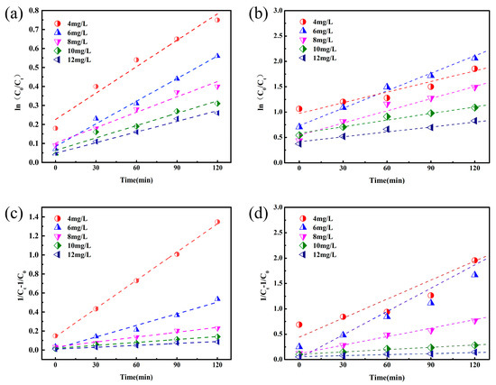 In order to further explore whether the photocatalytic degradation of TC solution by composite materials conforms to the kinetic reaction order, this experiment takes a TC solution with different initial concentrations as the condition to measure its degradation effect. According to the first order (Formula (2)) [43] and the second-order-reaction kinetic equation (Formula (3)) [44], the simulation study was carried out: