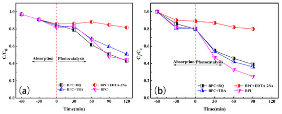Figure 9a shows that the TC degradation efficiency of Ti-BPC in the control group reached 60% in 2 h. After different radical trapping agents were added, the catalytic effect in each test tube changed to different degrees, and the degradation rate of TC was only 12% 2 h after adding EDTA to trap holes (h+). The results show that the photocatalytic degradation effect of the catalyst was significantly reduced after the addition of EDTA, whereas the addition of tert-butanol or BQ as the radical trapping agent only slightly altered the photocatalytic degradation effect. Figure 9b shows that the photocatalytic TC degradation efficiency of Mn-BPC in the control group was 82.11%, while the addition of tert-butanol or BQ as a radical trapping agent had a certain effect on the degradation efficiency; these results demonstrate that hydroxyl radicals (OH·) and electrons (e−) have a certain effect on the degradation efficiency but are not the main effective substances. When EDTA-2Na was added as a hole (h+) trapping agent, the degradation effect was greatly reduced, with a degradation rate of only 20.33%. The results indicate that holes and hydroxyl radicals are the main active species for the degradation of TC by the two catalysts and that electrons also have certain effects on the degradation efficiency.