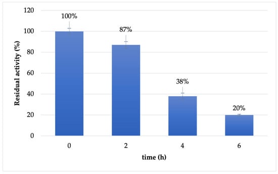 The stability of soluble Cf-β-Man was investigated in the optimal conditions reported for enzyme activity (maleate buffer 100 mM pH 6.5). As reported in Figure 1, the enzyme is almost stable in the first two hours of the transglycosylation reaction (87% retained activity). However, already after 4 h of incubation, the retained activity of the biocatalyst drops at 38%, reaching 20% of retained activity after 6 h of incubation.