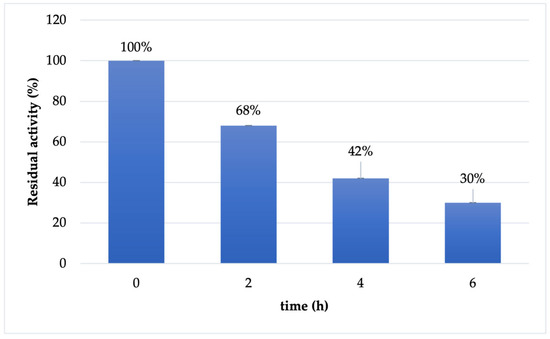 The stability of immobilized Cf-β-Man derivative was tested in reaction conditions (maleate buffer 100 mM pH 6.5). As reported in Figure 2, the immobilized derivative has a similar behavior to the soluble enzyme: the enzyme is almost stable in the first two hours of the reaction (68% retained activity). However, already after 4 h of incubation, the retained activity of the biocatalysts drops at 42%, maintaining 30% of activity after 6 h of incubation.