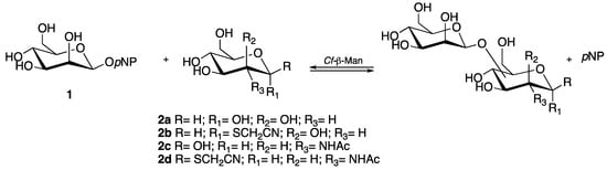 The activity and regioselectivity of soluble Cf-β-Man was studied in the transglycosylation reaction using different sugar acceptors, such as d-mannose (2a), d-mannose-SCH2CN (2b), N-acetyl-d-glucosamine (2c), and N-acetyl-d-glucosamine-SCH2CN (2d). The formation of the transglycosylation disaccharide products was monitored by LC-MS.