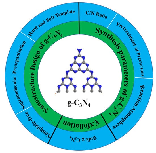 In this review, the synthesis parameters of g-C3N4 are discussed first, mainly including the types of g-C3N4 precursors, reaction temperature, reaction atmosphere and reaction duration. The influence of different synthesis parameters of g-C3N4 are compared and summarized in detail here. Then, the construction approaches of various nanostructures are reviewed, such as hard and soft template, supramolecular preorganization, template-free approaches, etc. It again manifests that the specific surface area and photocatalytic efficiency of g-C3N4 can be directly manipulated by means of different nanostructure design approaches. Furthermore, the characteristics of different exfoliation methods are summarized for stark comparisons. Liquid exfoliation of bulk g-C3N4 has gradually become the most popular exfoliation method. The overall framework of synthesis and properties of g-C3N4 for enhanced photocatalytic performance are illustrated in Figure 1. Finally, the problems of g-C3N4 materials in photocatalysis and the prospect of further development are proposed, which may be favorable to the design of more efficient and practical g-C3N4 or g-C3N4-based photocatalyst.