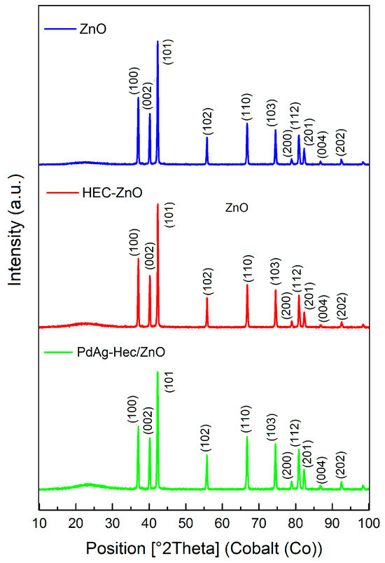 The results of X-ray powder diffraction analysis (XRD) of the ZnO, HEC/ZnO and PdAg-HEC/ZnO are shown in Figure 1. All XRD patterns showed characteristic peaks at 37.0°, 40.2°, 42.3°, 55.8°, 66.7°, 74.5°, 78.9°, 80.9°, 82.3°, 86.8° and 92.6°, corresponding to the (100), (002), (101), (102), (110), (103), (200), (112), (201), (004) and (202) planes of ZnO wurtzite structures (JCPDS card no. 79-0206) [61]. The broad peak observed at 23° in the polymer-modified materials could be attributed to the amorphous phase of the HEC [62]. No peaks related to palladium (Pd or PdO) and silver (Ag or AgCl) species were observed on the XRD pattern of the PdAg-HEC/ZnO catalyst. This can be explained by the low metal (Pd and Ag) content in the catalyst and the small particle sizes [63].