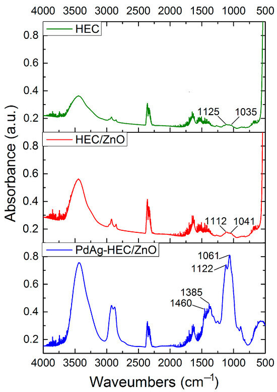 The interaction of the polysaccharide with other components of the PdAg-HEC/ZnO catalyst and the formation of a polymer—metal complex on the ZnO surface was confirmed using infrared spectroscopy (IRS). Figure 2 shows the IR spectra of HEC, HEC/ZnO and PdAg-HEC/ZnO. HEC shows characteristic bands at 1061 and 1122 cm−1, corresponding to the C–O–C stretching vibrations in the glucopyranose structure and C–O anti-symmetric vibrations, respectively [65,66].