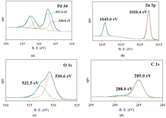 An analysis of the XPS spectrum of the Pd 3d (5/2) region (Figure 4a) showed the presence of palladium in the catalyst o in both oxidized (Pd2+) and reduced (Pd0) states at binding energies of ~337.3 and ~336.0 eV, respectively [68]. The presence of a small amount of zero-valent palladium was probably caused via the photocatalytic reduction of Pd2+ in the presence of zinc oxide, which is known as an efficient photocatalyst [69]. This suggested that a small part of the introduced palladium interacted with zinc oxide. This was confirmed by the fact that the binding energy of Pd0 had a positive shift (ca. 0.6 eV) due to a strong metal–support interaction and the formation of PdZn species [70], which was consistent with the microdiffraction analysis data (Tables S2 and S3). In the case of palladium in an oxidized state, such shifting was not observed, confirming the stabilization of Pd0 particles using the polymer. The peaks at 1020.4 and 1045.0 eV (Figure 4b), corresponding to Zn 2p (3/2) and Zn 2p (1/2), respectively, were attributed to the presence of Zn2+ ions in a zinc oxide crystal lattice [71]. The peaks shifted toward smaller energies in comparison with typical ZnO [72,73], a phenomenon attributed to the interaction of Zn2+ with the oxygen-containing functional groups of HEC. It should be noted that similar negative shifting was observed in nanosized zinc oxide particles [74,75].