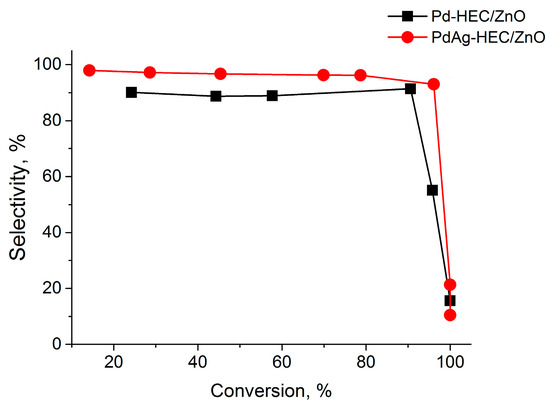 Thus, the characterization of polysaccharide-modified catalysts using physical–chemical methods such as spectrophotometry, potentiometry, elemental analysis, XRD, IRS, BET, TEM and XPS indicated that polysaccharide and metal (Pd and Ag) ions were quantitatively adsorbed onto zinc oxide and that the polymers interacted with both ZnO and the active-phase particles formed. The role of polymers was both to fix Pd and Ag species onto the zinc oxide surface and guarantee their stabilization. This was consistent with the data obtained in our prior study for similar Pd-PVP/ZnO catalysts [64]. However, in the case of Pd-HEC/ZnO, a small amount of Pd also interacted with ZnO, forming the PdZn species. This was attributed to the lesser affinity of HEC functional groups to metal ions in comparison with those of PVP.