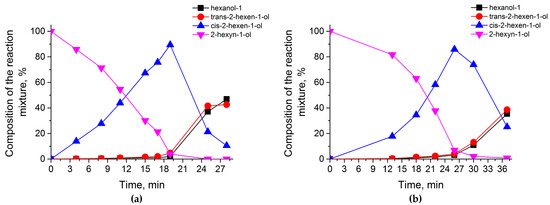 Changes in the composition of the reaction mixture during the hydrogenation of 2-hexyn-1-ol in the presence of PdAg-HEC/ZnO (a) and PdAg-Chit/ZnO (b). Reaction conditions are presented in Figure 5.
