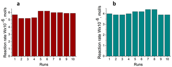 Further temperature increases to 50 °C led to a significant decrease in the reaction rate, which could be attributed to the shrinking of the surface polymer layer of the catalyst and the blocking of the active centers [64].