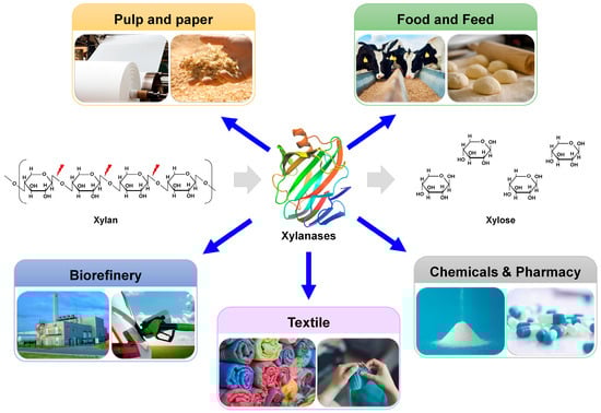 Xylanases are used as biocatalysts in multiple industrial fields, including the paper/pulp, food/feed, textile, chemical/pharmaceutical, and biorefinery industries [11,12] (Figure 1). During the bleaching of Kraft pulp in the paper industry, the lignin in wood chips is removed through sequential treatment with chlorine, chlorine dioxide, and NaOH [13]. Chlorine and chlorine dioxide generate persistent organic chemicals that are toxic to organisms and pose risks to human health. The pretreatment of paper pulp with xylanases increases the chemical lignin extraction efficiency and reduces the amount of chlorine and chlorine dioxide required for extraction. Therefore, xylanases are frequently used for the biobleaching of pulp, thereby improving final paper quality [11]. In the food industry, xylanases can be added to baking dough to improve the quality of baking products by enhancing gluten elasticity, texture, and moisture content [14]. In the feed industry, xylanases are applied as feed ingredients to improve digestibility and produce bioactive prebiotic xylooligosaccharides [15]. In biorefinery, lignocellulosic biomass is converted to various industrially valuable materials, including sugars, fuels, and chemicals [16]. Xylanases are further involved in the saccharification process of lignocellulose biorefinery, contributing to the production of fermentable sugars [17].