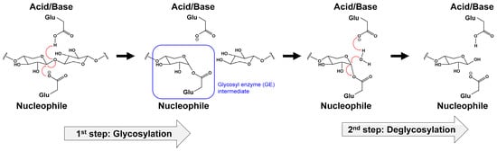 The two catalytic Glu residues of Xyl-11 catalyze a double-displacement mechanism involving a covalent glycosyl enzyme intermediate [39,40,41]. The retaining mechanism of GH11 can be divided into two main steps: glycosylation and deglycosylation (Figure 2). In the first step (glycosylation), the acid–base Glu residue acts as an acid and protonates the substrate. The nucleophile Glu residue facilitates the departure of the leaving group and the formation of the α-glycosyl enzyme intermediate during the oxocarbenium-ion-like transition state. In the second step (deglycosylation), the acid–base Glu residue acts as a base and abstracts a proton from a water molecule. Subsequently, the molecule attacks the anomeric carbon of the α-glycosyl enzyme intermediate. Furthermore, a second substitution occurs, where the anomeric carbon produces a product with the β configuration identical to that of the substrate (Figure 2).
