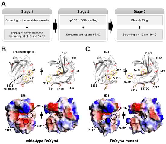 Wide-type BsXynA has optimal hydrolytic activity at 50 °C and pH 6.0 for oat spelt xylan substrate [44]. Ruler et al. engineered BsXynA using the DE method to generate a highly thermostable enzyme [44]. DE via error-prone PCR coupled with a single generation of DNA shuffling has been performed to increase the optimal temperature and obtain thermostable BsXynA variants. Four BsXynA mutants (Q7H, G13R, S22P, and S179C) showed an increase in melting temperature of 20 °C [44]. Using these BsXynA variants as a starting point, further DE experiments were performed to obtain an alkali-tolerant/thermophilic enzyme for application in the pulp industry [49]. DE was performed in the following three stages (Figure 4A): (1) A XynA mutant was produced via error-prone polymerase chain reaction (epPCR) and screened on xylan-containing agar plates at pH 8; (2) the mutants obtained were further mutated through a combination of epPCR and DNA shuffling, and their alkaline pH activity was measured at pH 12.0 and 55 °C; and (3) mutants active at pH 12.0 and 80 °C were generated using the DNA shuffling method. The final engineered BsXynA contained eight mutations (Q7H/G13R/S22P/S31Y/T44A/I51V/I107L/S179C). The optimal activity was at pH 6.5, and the specific activity at pH 8–9 increased three-fold when compared with that of the wild-type BsXynA.