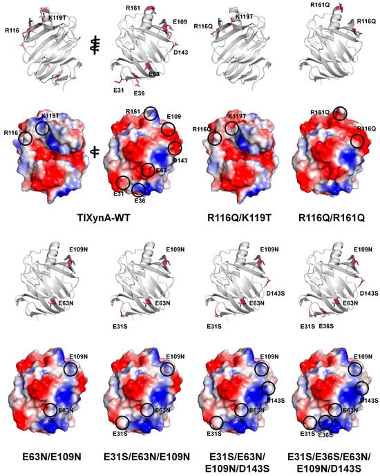 Electrostatic surface representation of the model structure of TIXynA and its mutants.