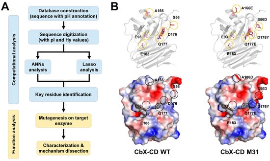 Evolutionary history reveals a relationship between amino acid sequences of enzymes and their optimal catalytic conditions. Ma et al. developed a strategy for shifting the pH optima of GH11 xylanases using biomathematics and biostatistics [36]. Among more than 1000 GH11 xylanase sequences, 113 sequences of non-redundant and well-characterized enzymes were selected, and a database with annotated pH optima was established. The amino acid sequences were digitized according to their isoelectric point and hydropathy index. The relationship between the sequences and their pH optima was analyzed using artificial neural networks (ANNs) and the least absolute shrinkage and selection operator (Lasso) algorithms (Figure 8A). This bioinformatics approach identified six potential residues (Trp21, Thr102, Thr120, Thr137, Ala166, and Asp176) based on the hydropathy index and eight residues (Asp23, Leu48, Ser56, Trp100, Thr102, Ala108, Ser153, and Gln177) based on the isoelectric point values, related to pH adaptation [36]. Furthermore, the identified residues were mutated in thermophilic xylanase from C. bescii (CbX-CD) [36]. The pH activity profiles of wild-type CbX-CD and the mutant enzymes were determined using beechwood xylan as substrate. The optimal pH of wild-type CbX-CD was 6.5. The pH optima for CbX-CD-D176Y and CbX-CD-Q177E showed an acidic shift up to 0.75 units. CbX-CD-S56D and CbX-CD-A166E also exhibited an obvious acidic shift. The pH optima of these mutants were clearly shifted to the acidic side. This result indicates that the mutations altered the pKa values of the catalytic residues rather than simply enhancing the tolerance of the enzyme to an acidic environment. All positive mutants (S56D, A166E, and Q177E) retained a considerable level of catalytic activity, namely 60–90% of the wild-type activity, at their pH optima. No remarkable optimal pH shifts were observed for CbX-CD-L48N, S137I, and S153T.