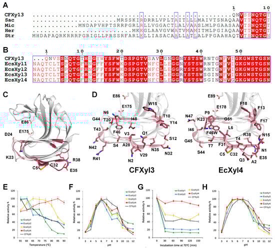 CFXyl3 N-terminal residues engineering: (A) partial N-terminal sequence alignment of CFXyl3 with GH11 xylanases from Streptomyces sp. (WP_093661817.1), Saccharothrix sp. (NUT48201.1), Micromonospora sp. (WP_168002960.1), and H. cretacea (WP_051760875.1); (B) partial N-terminal sequence alignment of CFXyl3 with engineered EcsXyl1–4. The mutated sites in EcsXyl1–4 are indicated by blue boxes; (C) positions of the mutation sites in EcsXyl1–4; (D) optimal temperature, (E) optimal pH, (F) thermal stability at 70 °C, and (G) pH stability of CFxyl3 and EcsXyl1–4. Original figures (E–H) were obtained from a previous study [45].