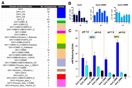 CBM-fused xylanases pH profile: (A) domain architectures (DAs) found in GH11 protein sequences in CAZy. Enzymatic activities of Xyn5, Xyn5-CBM2, and Xyn5-CBM9 on purified xylan (B) and rice straw (C). Original figures were obtained from a previous study [10] and modified.