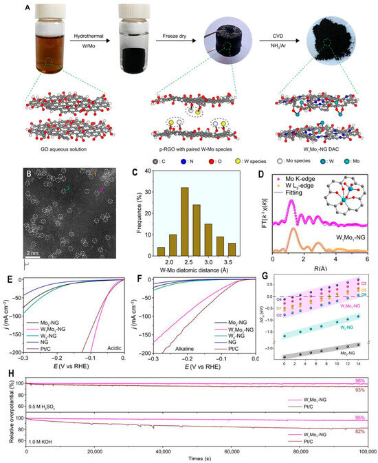 This paper reports the development of O-coordinated W-Mo dual-atom catalysts (DACs), W1Mo1-NG, for electrocatalytic HER over a wide pH range. The W1Mo1-NG catalyst is synthesized through a three-step hydrothermal self-assembly and chemical vapor deposition (CVD) method. In the W1Mo1-NG material, O-bridged W-Mo heteroatoms are inserted into the vacancies of nitrogen-doped graphene (NG) via the self-assembly of tungstate and molybdate precursors (Figure 2A). As revealed via aberration-corrected high-angle annular dark-field scanning transmission electron microscopy (AC HAADF-STEM), the distance between W-Mo atoms is below 3.6 Å (Figure 2B,C), markedly longer than Mo-Mo/W-Mo/W-W bonds, confirming that the W and Mo atoms are bridged by oxygen atoms. X-ray absorption fine structure (EXAFS) spectroscopy further demonstrates that the O-bridged W-Mo heteroatoms are stabilized on NG vacancy with a W-O-Mo-O-C configuration (Figure 2D). In electrocatalytic measurements, the as-prepared W1Mo1-NG catalyst delivers a current density of 10 mA/cm2 at an ultralow overpotential of 24 mV in 0.5 M H2SO4 (Figure 2E), outperforming Mo2-NG, W2-NG, nitrogen-doped graphene, and commercial Pt/C catalysts. Moreover, W1Mo1-NG exhibits an overpotential of 67 mV at 10 mA/cm2 in 1.0 M KOH (Figure 2F), displaying excellent catalytic activity over a wide pH range from 0 to 14. Density functional theory calculations reveal that the delocalized electrons in the distinctive W-O-Mo-O-C configuration provide near-optimal hydrogen binding energy, facilitating superior HER kinetics (Figure 2G). From an overarching perspective, it is imperative to place a strong emphasis on evaluating the stability of catalysts. This attribute holds utmost significance when considering the practical applications of these catalysts in industrial settings. After subjecting W1Mo1-NG to continuous electrolysis for a substantial duration of 80,000 s, operating at a current density of 10 mA/cm2, the remarkable observation is that it sustains an impressive 98% and 95% of its initial overpotential in both acidic and alkaline environments, respectively (Figure 2H).