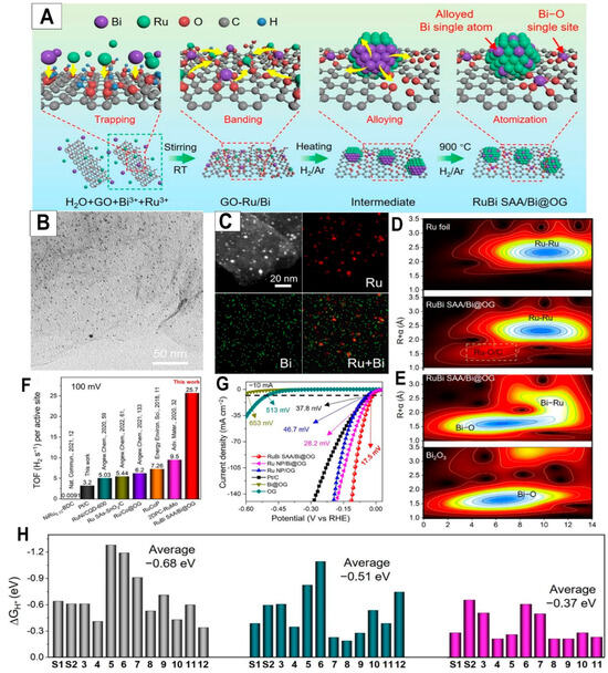 (A) Schematic illustration for preparation of RuBi SAA/Bi@OG (B) TEM. (C) The Ru and Bi elements in the RuBi SAA/Bi@OG were mapped using EDS. (D) The K3-weighted EXAFS signals of Ru foil, RuBi SAA/Bi@OG, and RuO2 were analyzed using wavelet transforms. (E) The wavelet transforms for the K3 -weighted EXAFS signals of Bi foil, RuBi SAA/Bi@OG, and Bi2O3. (F) The mass-specific activity at an overpotential of 50, 100, and 150 mV. (G) Comparison of TOF values of state-of-the-art Ru-based alloy HER electrocatalysts at an overpotential of 100 mV. (H) Calculated hydrogen-adsorption Gibbs free energy (∆GH*) of different adsorption sites in Ru13/O6G, Ru13/Bi1@O6G and Ru12Bi1/Bi1@O6G, respectively. Adapted with permission from [56], Copyright 2023 ANGEWANDTE CHEMIE.