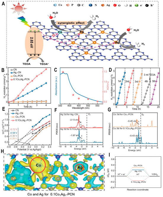 Figure 6A presents the proposed mechanism that the Co-Ag dual sites act as electron sinks for photogenerated electrons while the remaining holes oxidize water. This Co1Ag1-PCN DAC exhibited remarkably enhanced photocatalytic hydrogen evolution from water splitting under simulated sunlight, achieving an impressive H2 production rate of 1190 μmol g −1 h−1 (Figure 6B). In contrast, the incorporation of Ag or Co alone only led to moderate improvement over PCN. Figure 6C presents the high apparent quantum efficiency (AQY) of 1.49% at 365 nm, consistent with the enhanced light harvesting capability. Figure 6D highlights the impressive stability of Co1Ag1-PCN throughout numerous cycles, a quality of utmost importance for practical industrial use. The endurance of catalysts plays a pivotal role in ensuring sustained performance. Thorough assessments in real-world applications are crucial, as they provide insights into the catalyst’s potential usefulness in scenarios where durability and resilience are often the primary factors for success. Consequently, conducting comprehensive investigations and delivering detailed reports on catalyst stability are indispensable steps in evaluating their appropriateness for practical industrial applications. Figure 6E presents the Mott–Schottky plots suggesting the optimized band structure of Co1Ag1-PCN. The partial density of states calculated via DFT (Figure 6F,G) shows the band center shift closer to the Fermi level for the dual metal sites. Density functional theory calculations illustrate the modulated electronic structure and synergistic effects between the dual-metal centers (Figure 6H). The integration of Co redistributes the charge density surrounding Ag atoms, facilitating interfacial charge transfer.