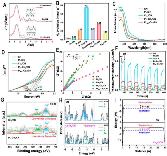 (A) Co K-edge R space EXAFS fitting results of Co1/CN and Pt1-Co1/CN samples. Insert are the schematic model of Co1N4 sites on Co1/CN and Co1N3 sites on Pt1-Co1CN obtained from EXAFS fitting results. (B) Photocatalytic hydrogen evolution activities of CN, Pt1/CN, Co1/CN, Pt1-Co1/CN and PtNC-Co1/CN samples (C) UV-vis absorption spectra. (D) Tauc plots. (E) Electrochemical impedance spectra (EIS). (F) Photocurrent response. (G) Co 2p XPS spectra of Co1/CN and Pt1-Co1/CN samples. (H) Projected density of states of CN and Co1N3/CN. (I) Work functions of CN and Co1N3/CN. Adapted with permission from [74], Copyright 2023 Elsevier B.V.; Elsevier.