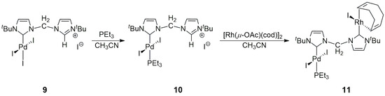 The simplest way to obtain a bis(imidazole-ylidene) carbene ligand precursor is to link two imidazolium units by a suitable alkyl, aryl, or other kind of bridge between the two unsubstituted nitrogens [21,22]. This technique was used by Cowie and co-workers for the synthesis of 11 (Scheme 2) [23]. One of the C2 carbenes was coordinated to Pd, while the remaining imidazolium moiety was metalated by [Rh(μ-OAc)(cod)]2 to yield the Pd/Rh heterobimetallic NHC complex 11 (the acetate served as an internal base). The cod ligand (1,5-cyclooctadiene) could be easily replaced by CO, affording the dicarbonyl product. The analogous Pd/Ir(cod), Pd/Ir(CO)2, and Ir/Rh complexes were also prepared and characterized. However, no catalysis by these heterobimetallic NHC complexes was reported.