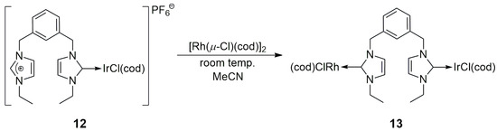 Braunstein and co-workers reported the synthesis of the bis(N-ethylimidazolium) compound 12, where the two imidazolium units were attached to an m-xylyl linker (Scheme 3) [24]. The deprotonation of 12 under the effect of LiN(SiMe3)2 afforded the free dicarbene. Interestingly, the reaction of this dicarbene with [Ir(μ-Cl)(cod)]2 did not lead to the formation of a chelate Ir complex; instead, the reaction gave either the classical mono- or bis-carbene Ir-NHC complexes. This observation opened the way for sequential metalation, in which the free dicarbene was first reacted with [Ir(μ-Cl)(cod)]2 with the formation of 12, followed by another metalation step using [Rh(μ-Cl)(cod)]2, which led to the heterobimetallic product 13. The new NHC complexes were not applied as catalysts.