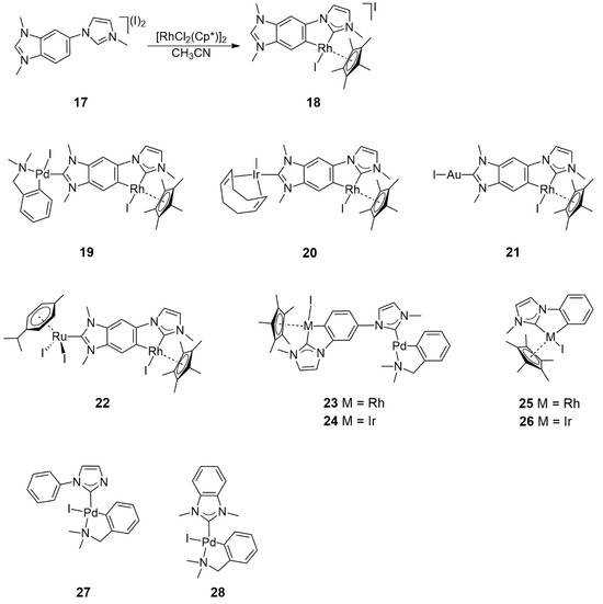 A mixed imidazolium/benzimidazolium bis(carbene) precursor, 17 (Scheme 5), was synthesized by Hahn, Peris, and co-workers [26]. The reaction of this compound with 1 equiv [IrCl2(Cp*)]2 (Cp* = pentamethylcyclopentadienyl anion) in the presence of NaOAc as a base led to the formation of a mixture of monometallic iridium complexes. However, under similar conditions, [RhCl2(Cp*)]2 selectively yielded 18, in which Rh binds to the C2 carbenic carbon of the imidazole moiety and simultaneously orthometalates the phenyl ring of the benzimidazolium unit (Scheme 5). The formation of such a metallacycle contributes to the selective formation of the imidazol-2-ylidene type complex, while the benzimidazolium part remains available for further reactions. Indeed, the benzimidazole-ylidene complexes Rh/Pd (19), Rh/Ir (20), Rh/Au (21), and Rh/Ru (22) were prepared from 18 with the use of the Ag2O-based method of synthesis. For a comparison of catalytic purposes, several other heterobimetallic complexes and their monometallic fragments (23–28) were synthesized (Scheme 5).