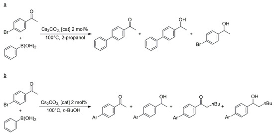 Tandem Suzuki-Miyaura C-C coupling/transfer hydrogenation of 4-bromoacetophenone in 2-propanol (a) and in n-butanol (b).