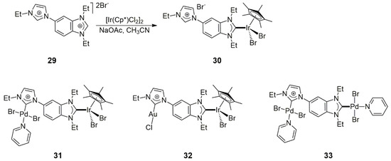 In a related study, Nishad, Kumar, and Rit [27] found that reaction of 29 and 0.5 equiv [IrCl2(Cp*)]2 afforded selectively the monometallic Ir-carbene complex 30, with a pendent N-ethylimidazolium unit. Further metalations with Pd(OAc)2 or Ag2O/Au(THT) yielded the bimetallic complexes 31 (Ir/Pd) and 32 (Ir/Au), respectively. For comparison, the analogous Pd/Pd homobimetallic complex 33 was also prepared (Scheme 7).