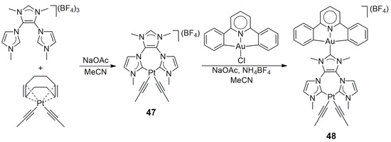 In a related study [31], Gonell, Poyatos, and Peris synthesized an Au/Pt heterobimetallic NHC complex based on the Y-shaped tris-NHC ligand precursor developed by them earlier [29]. In the first step, the ligand precursor tris-azolium salt was reacted with the bis(alkynyl) complex [Pt(CCPh2)(cod)]. This reaction resulted in complex 47, which contained the Pt(CCPh)2 moiety in chelate coordination. The reaction of this compound with a pincer-type (CNC)Au(I)Cl complex in the presence of NaOAc in acetonitrile led to the desired heterobimetallic Au/Pt product 48 (Scheme 12). In addition to NMR spectroscopy and HR mass spectrometry, 48 was characterized by UV-Vis absorption and emission spectroscopy, as well as by cyclic voltammetry and differential pulse voltammetry. Both 47 and 48 were found emissive in the solid state but non-emissive in solution. It could also be concluded that the emission was centered on the Pt(II) fragment.