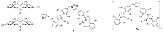 Hahn, Li, and co-workers reported a general strategy for the synthesis of oligomeric or polymeric NHC complexes having strictly pre-determined positions of the NHC units and metal ions [34]. The strategy is based on the click reaction of suitable monomeric NHC–metal complexes (secondary building units or SBUs) having p-azidophenyl and p-ethynylphenyl NHC wingtips (Scheme 15). The azide group could be directly attached to the aromatic ring or via a flexible methylene linker. The reaction of the azide-containing SBUs with phenylethynyl-substituted NHC complexes resulted in the formation of polymers with alternating metal–NHC units joined together by 1,2,3-triazole (or the more flexible methylene-triazole) linkers along the polymeric chain. In cases when one of the SBUs was an azide-modified copper complex, the click reaction proceeded rapidly without an external catalyst and, depending on the combination and molar ratios of the SBUs, resulted in heterodimetallic dimers, trimers, or polymers (only the Cu/Ag bis-NHC complex 57 and the −[Cu~Ag]n− polymer 58 are shown in Scheme 15). The Cu/Ag derivatives could be further transmetalated in reaction with, e.g., allylpalladium(II) chloride dimer [PdCl(allyl)]2 to yield analogous Cu/Pd polymers.