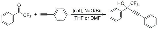 Alkynylation of 2,2,2-trifluoro-1-phenylethanone with phenylacetylene catalyzed by 57 and 58.