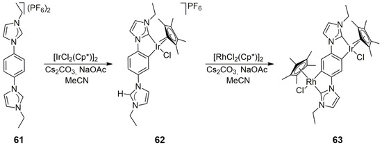 In addition to the formation of NHC complexes through metal–carbene coordination, product stability is often increased by the orthometalation of a suitable aryl substituent attached to an imidazolium nitrogen. Such a case was revealed by Maity, Hahn, and co-workers [36] in the reaction of 1,4-bis(3-ethyl-1-imidazolium)benzene 61, originally synthesized by You et al. [37] and later by the Hahn group via a modified procedure [38]. As shown in Scheme 18, the reaction of 61 with [IrCl2(Cp*)]2 yielded 62, which afforded the heterobimetallic 63 upon further metalation with [RhCl2(Cp*)]2 (both reactions took place in acetonitrile solution in the presence of Cs2CO3 and NaOAc). Both Ir(III) and Rh(III) cyclometalated the 1,4-phenylene linker between the NHC units. Orthometalation in 62 and double orthometalation in 63 were established by 2D NMR spectroscopy. Furthermore, the determination of the solid-state structure of 62 unambiguously confirmed this structural feature. The catalytic properties of 62 and 63 were not investigated.