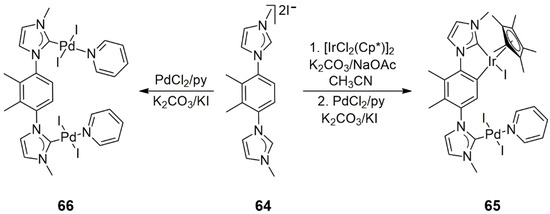 In a related study, Maity and co-workers synthesized 1,4-bis(3-methyl-1-imidazolium)-2,3-dimethyl-benzene 64 (Scheme 19) [39]. Although 64 is very similar to the previously mentioned ligand 61, the two methyl substituents on the 1,4-phenylene linker prevented the double orthometalation of the bridging phenylene moiety. In contrast, the reaction of 64 with [IrCl2(Cp*)]2 in acetonitrile afforded a monometallic cyclometalated Ir(III) NHC complex, which could be further metalated on the second NHC carbene with PdCl2 in pyridine. The overall reaction yielded the PEPPSI-type Ir/Pd bimetallic bis-NHC complex 65. An X-ray diffraction study of 65 revealed a 6.14 Å distance between the two metal centers in the solid-state structure. The similar reaction of 64 with PdCl2/pyridine led to the formation of the analogous Pd/Pd complex 66 (no cyclometalation in this case).