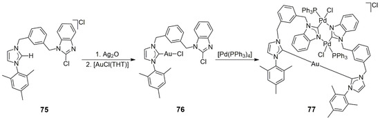 The m-xylyl-bridged imidazolium/chlorobenzimidazole ligand precursor 75 gave the imidazolylidene–Au complex 76, in which the chlorobenzimidazole moiety remained available for metalation by oxidative addition to [Pd(PPh3)4] [43]. The Pd/Au heterobimetallic product 77 could be isolated both as the chloride (29%) and as the PF6 salt (56%). An alternative pathway for the synthesis of 77 included the formation of the gold complex of imidazolium-2-ylidene in the first step, followed by the oxidative addition of the C-Cl bond to [Pd(PPh3)4]. This example clearly shows the possibility of sequential site-selective metalation due to the different reactivities of the N-CH-N and N-C(Cl)-N groups (Scheme 23).