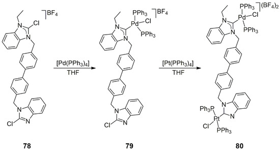 Regioselectivity in double oxidative addition reactions of bis-NHC precursors also resulted in heterobimetallic bis-NHC complexes [44]. In the reaction of the 4,4′-p-biphenylene-bridged chlorobenzimidazole/ethylchlorobenzimidazolium compound 78 with one equivalent of [Pd(PPh3)4], the monopalladium NHC complex 79 was formed selectively in the oxidative addition reaction of the 1,3-dialkyl-2-chlorobenzimidazolium moiety (3 h, 75 °C, THF). In a slower reaction (18 h, 100 °C), [Pt(PPh3)4] underwent oxidative addition at the non-alkylated benzimidazole part, yielding the bimetallic Pd/Pt complex 80 in a 24% yield (Scheme 24). The analogous Pd/Pd bis-NHC complex could be obtained in the reaction of 78 with [Pd(PPh3)4] under somewhat milder conditions (18 h, 75 °C) in a 65% yield, showing the higher reactivity of Pd(0) compared to Pt(0) in oxidative additions.