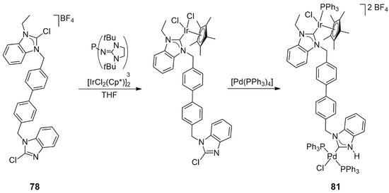 Synthesis of the Pd/Ir heterobimetallic NHC complex 81 via selective sequential reactions of C-Cl moieties in 78, assisted by tris(1,3-tert-butilimidazolidin-2-ylideneamino)phosphine.