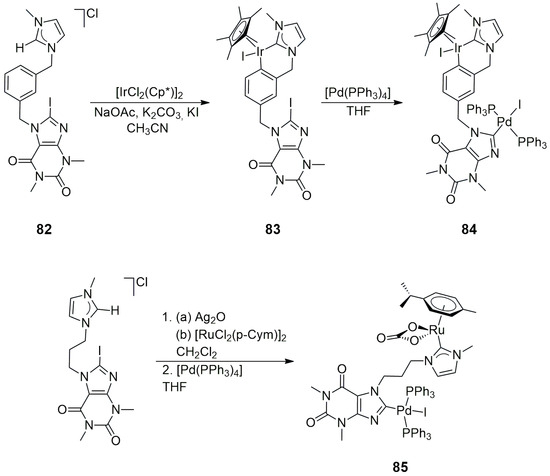 In the bis-NHC precursor 82, an N-ethylimidazolium group and an 8-iodotheophylline unit were joined by an m-xylyl linker. This NHC precursor was cleanly monometalated at the imidazolium part with [IrCl2(Cp*)]2, and the resulting cyclometalated Ir(III) complex 83 was transformed into the Ir/Pd heterobimetallic bis-NHC product 84 under mild conditions (25 °C, in 1 day) (Scheme 26). The Ru/Pd heterobimetallic compound 85 was similarly obtained by the metalation of the imidazolium part of the propyl-bridged precursor with Ag2O/[RuCl2(η6-p-cymene)]2 (p-cymene = 4-isopropyltoluene), followed by the oxidative addition of C(8)-I in the 8-iodotheophylline unit to [Pd(PPh3)4] (Scheme 26) [46]. The coordinated carbonato ligand was formed by the oxidation of the CH2Cl2 solvent in the presence of silver salts.