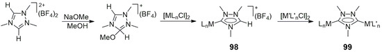 In this section, we review the synthetic methods of those NHC complexes in which—in most cases—the formation of the heterobimetallic compounds was not assisted by other interactions (e.g., cyclometalation) or coordination to other donor groups (anchors) of the ligand.
