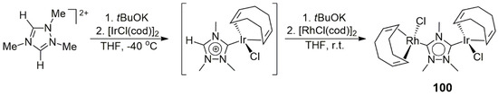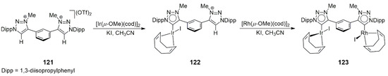Zamora, Ferguson, and Cowie synthesized a 1,3-phenylene-linked bis-triazole in the click reaction of 1,3-dialkynylbenzene and 2-azido-1,3-diisopropylbenzene, which was converted to the linked bis-triazolium trifluoracetate 121 with the use of methyl triflate in CH2Cl2 at −78 °C [64]. Compound 121 could be stepwise deprotonated and metalated simultaneously with the use of [M(μ-OMe)(cod)]2 (M = Ir, Rh), reactions in which the methoxy group plays the role of an internal base. For example, the first reaction with [Ir(μ-OMe)(cod)]2 yielded the half-metalated 122 Ir-triazolilydene complex, still having a pendant triazolium moiety. The reaction of the latter with [Rh(μ-OMe)(cod)]2 led to the formation of the heterobimetallic Ir/Rh bis-mesoionic carbene (MIC-MIC) complex 123 (Scheme 42). All new compounds were thoroughly characterized by NMR spectroscopy; however, no X-ray diffraction study of 123 could be performed in in lack of suitable single crystals. Furthermore, the catalytic properties of the new complexes were not investigated.