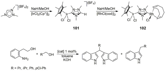The catalytic activity of the Ir/Pd heterobimetallic bis-NHC complex 65 was studied in the α-arylation of oxindole in toluene solutions (Scheme 20). In comparison to the homometallic counterpart 66, the heterobimetallic complex 65 showed slightly higher activities both with bromobenzene (32% vs. 26% isolated yields) and with 2-bromotoluene (53% vs. 41% isolated yields). Similarly, in the Suzuki–Miyaura cross-coupling of 4-bromobenzaldehyde and phenylboronic acid, 65 and 66 showed comparable activities (99% vs. 83% conversions in 5 h). Under the same conditions, with 4-toluylboronic acid, the yield of the coupled product was 99% with both catalysts. Note that these reactions were carried out with water as a solvent. Conversely, when the solvent was changed for 2-propanol/THF and KOtBu was added as a base, tandem Suzuki–Miyaura coupling/transfer hydrogenation took place both with 4-bromobenzaldehyde and 4-bromoacetophenone as substrates. In these reactions, 65 was consistently more efficient, with yields up to 85%, than a 1:1 mixture of its mononuclear Pd(II) and Ir(III) counterparts (highest yield of 41%). It was concluded that the outstanding activity of the Ir/Pd heterobimetallic bis-NHC complex in the tandem C–C cross-coupling/transfer hydrogenation reaction was most probably due to the interaction between the Ir and Pd centers in the molecule.