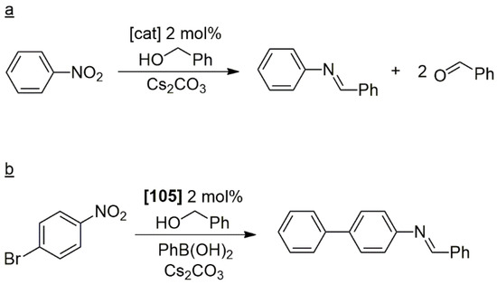 - Zanardi, A.; Mata, J.A.; Peris, E. One-Pot Preparation of Imines from Nitroarenes by a Tandem Process with an Ir-Pd Heterodimetallic Catalyst. Chem. Eur. J. 2010, 16, 10502–10506. [Google Scholar] [CrossRef] [PubMed]